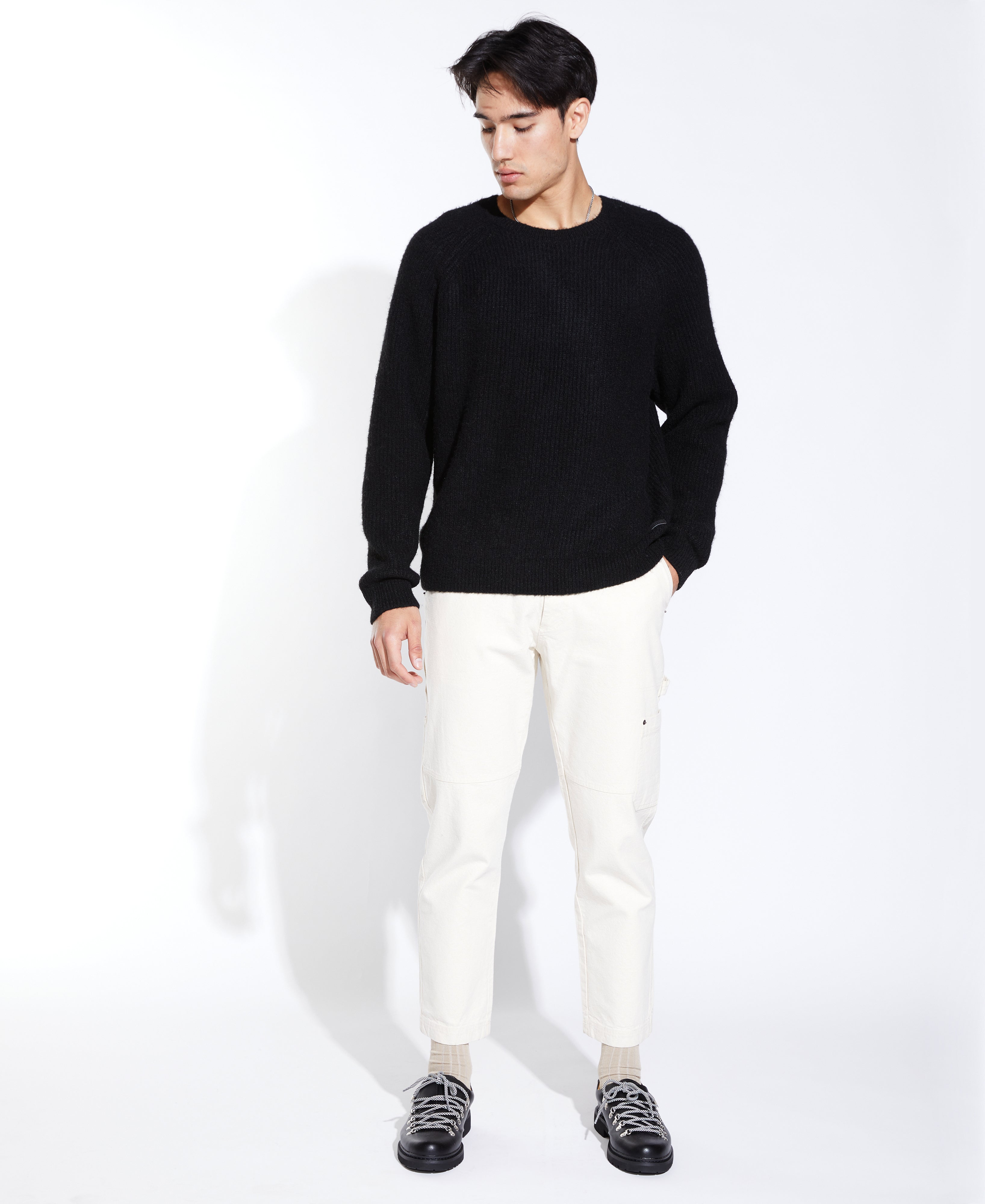 A classic staple with a modern twist. We upgraded the classic crewneck raglan sweater by issuing it in our new oversized fit ensuring a very loose and comfortable fit around the body as well as using a super plush and fuzzy 1x1 chunky sweater rib knit which you can either dress up or down.