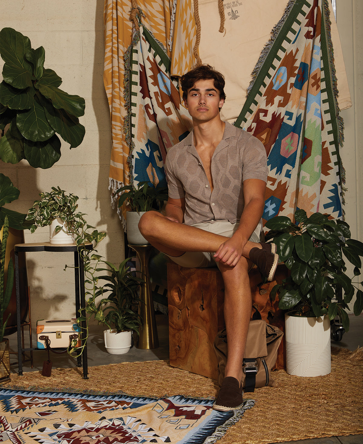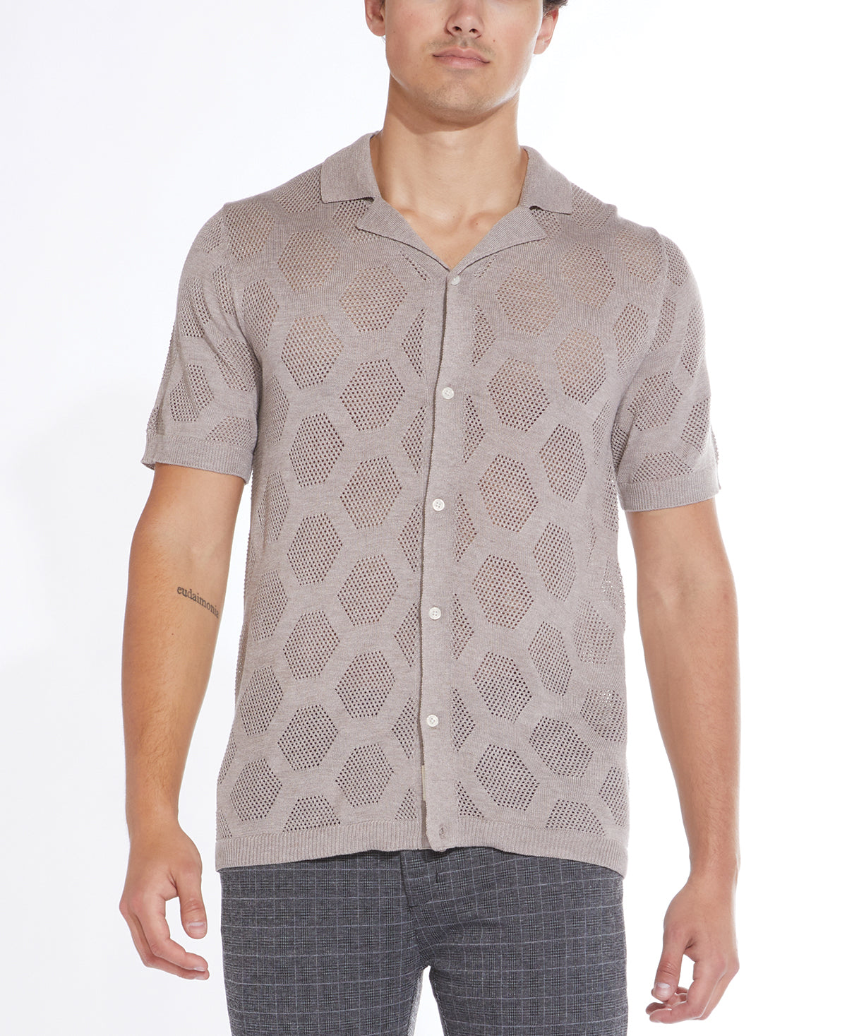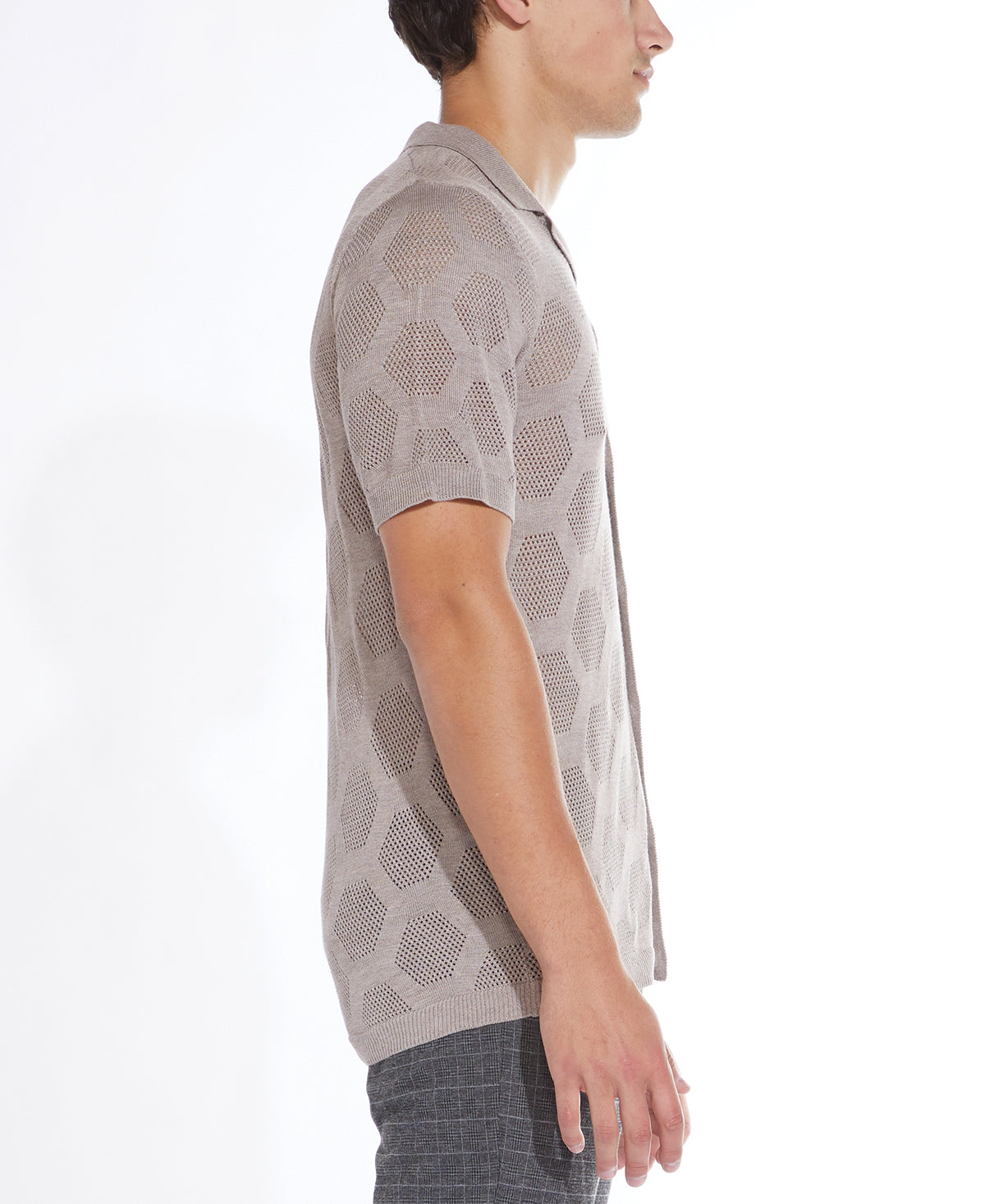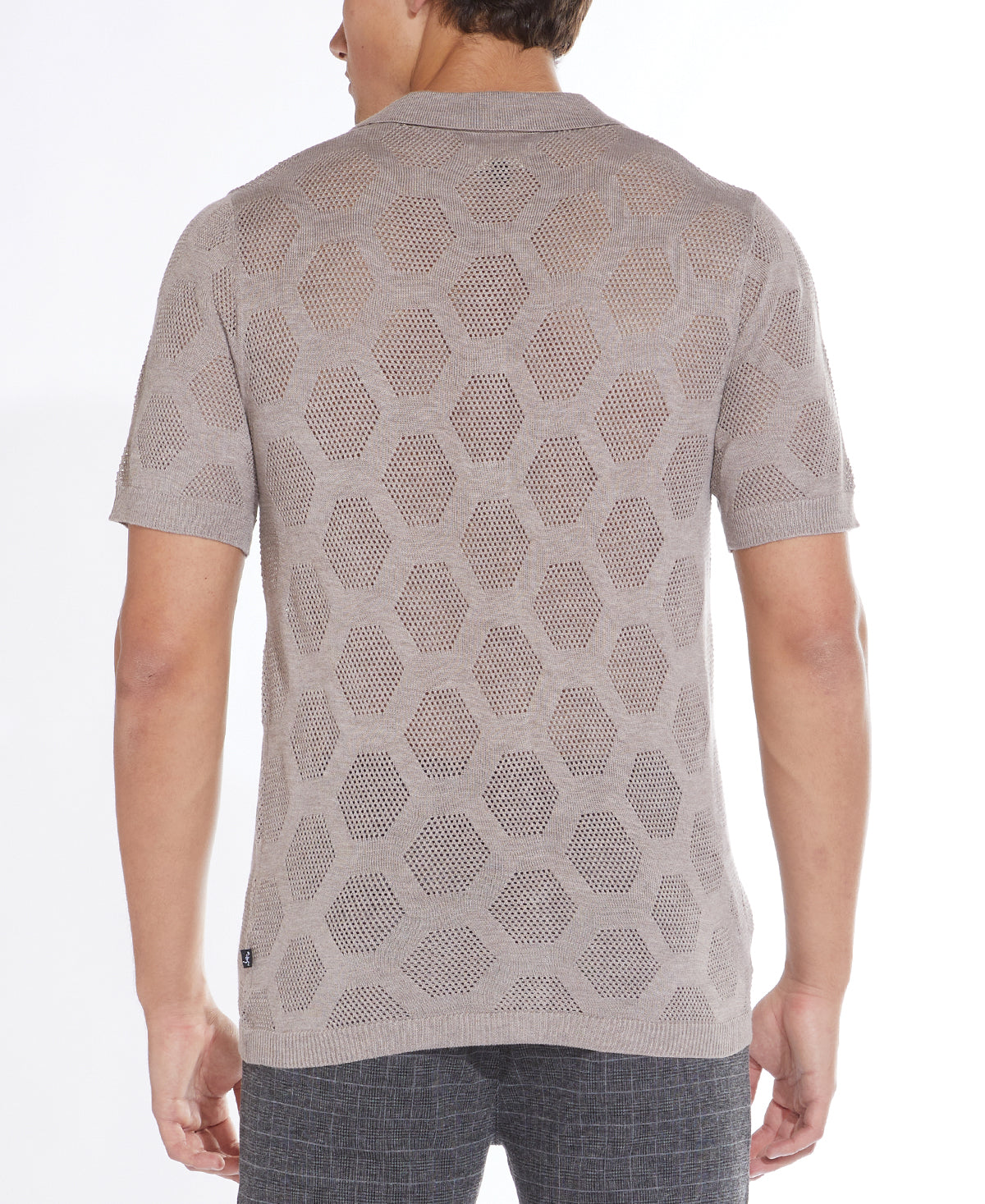 Specialized sweater knit combining jersey and crochet knitting techniques in an allover hexagonal pattern