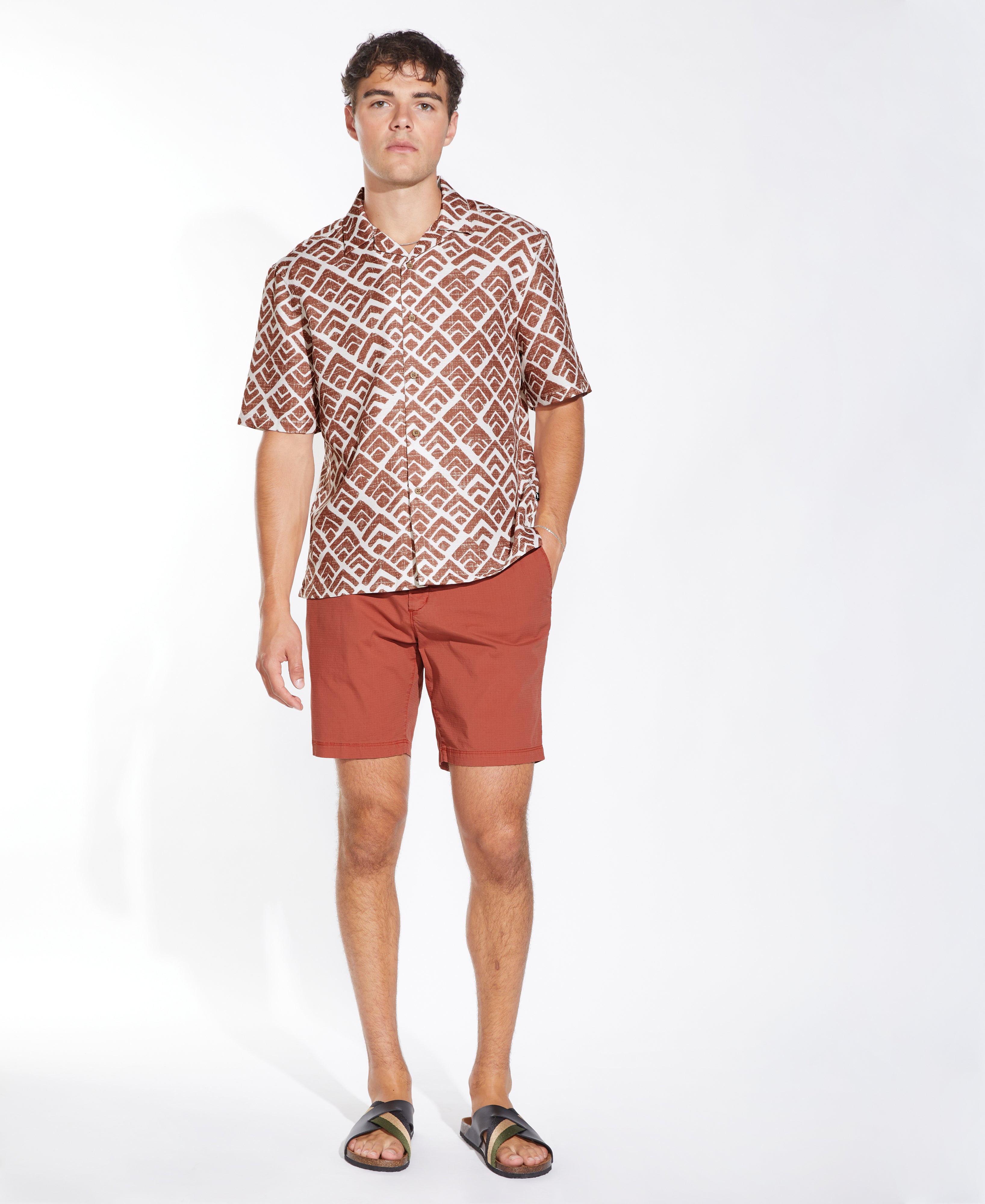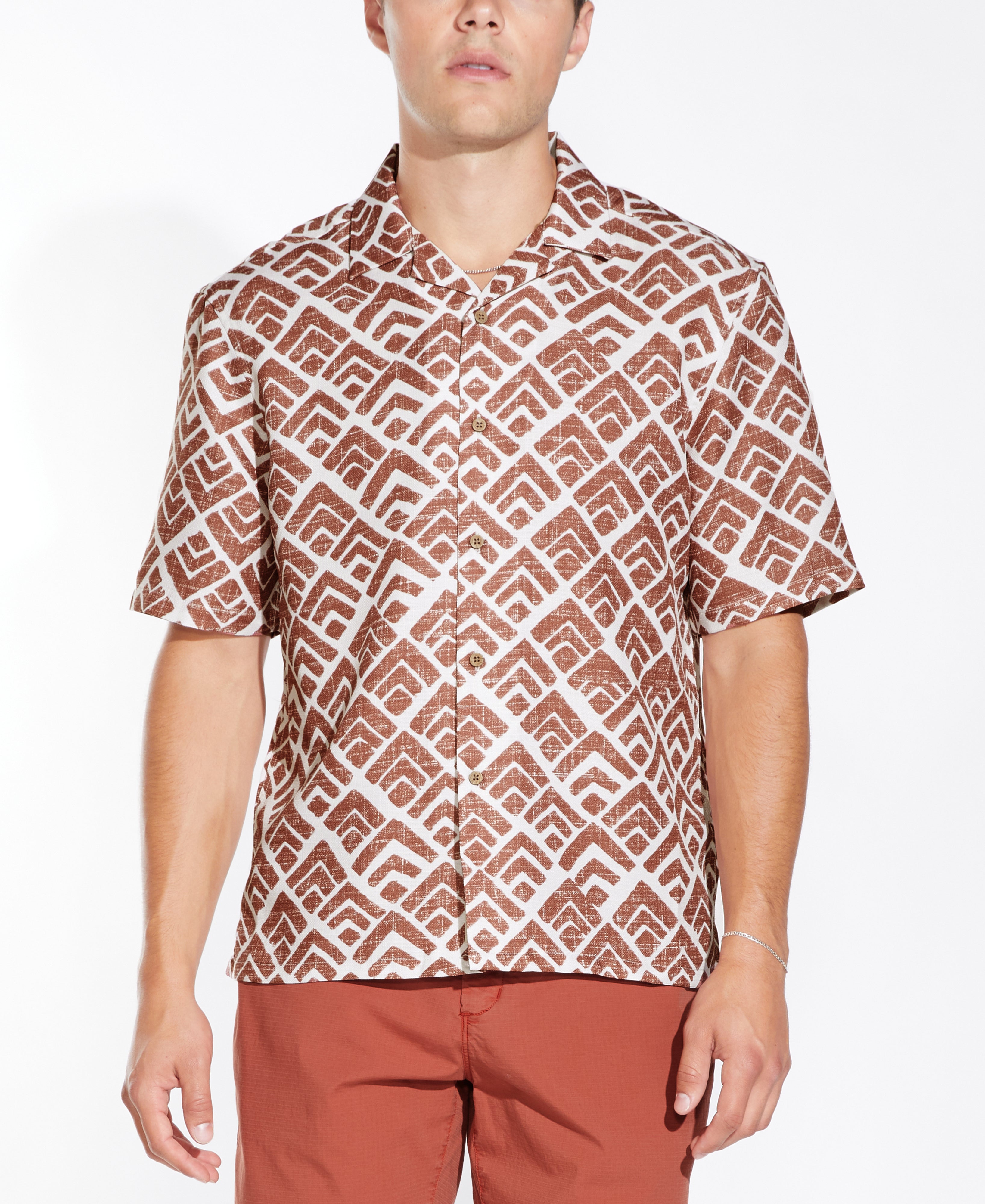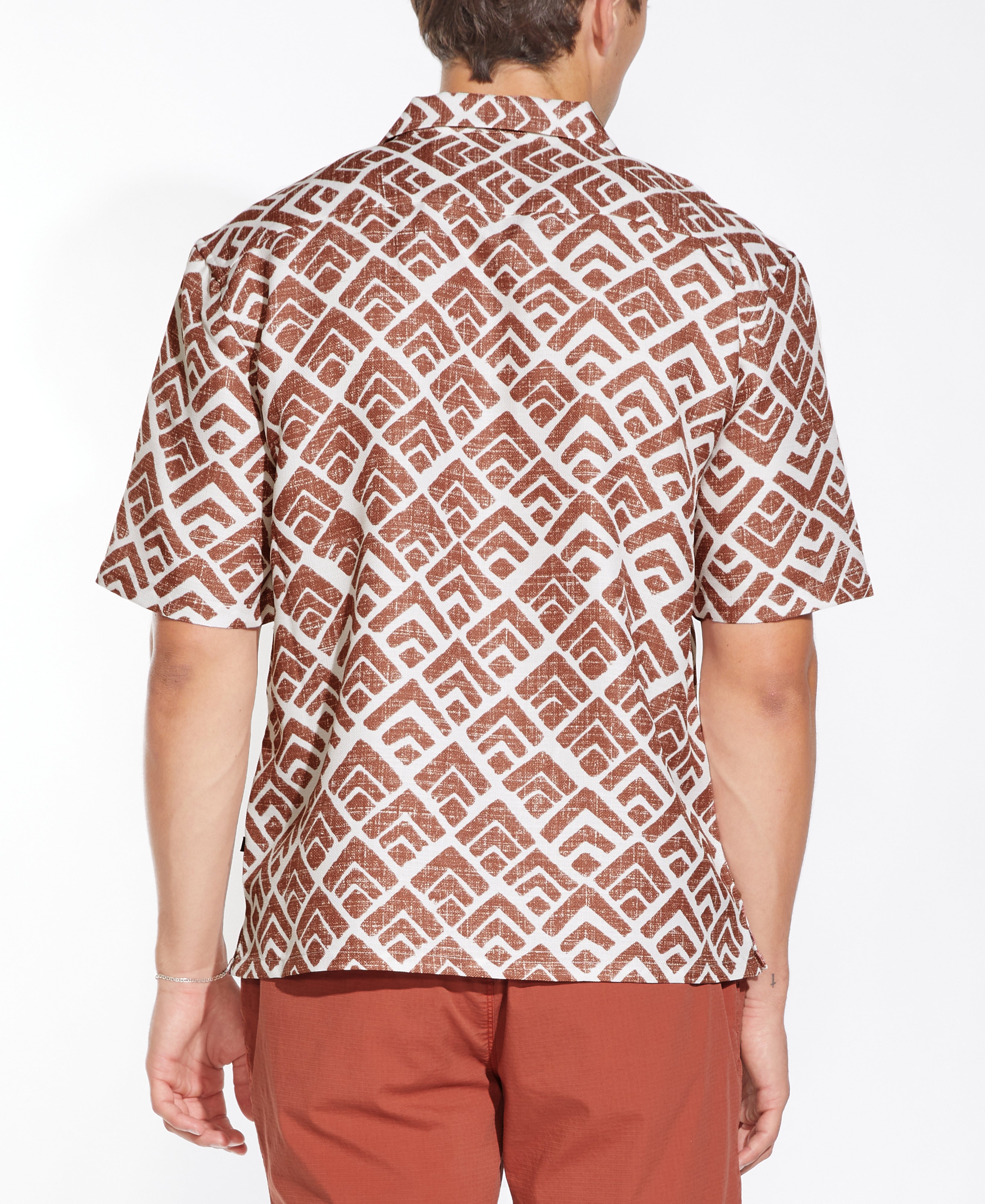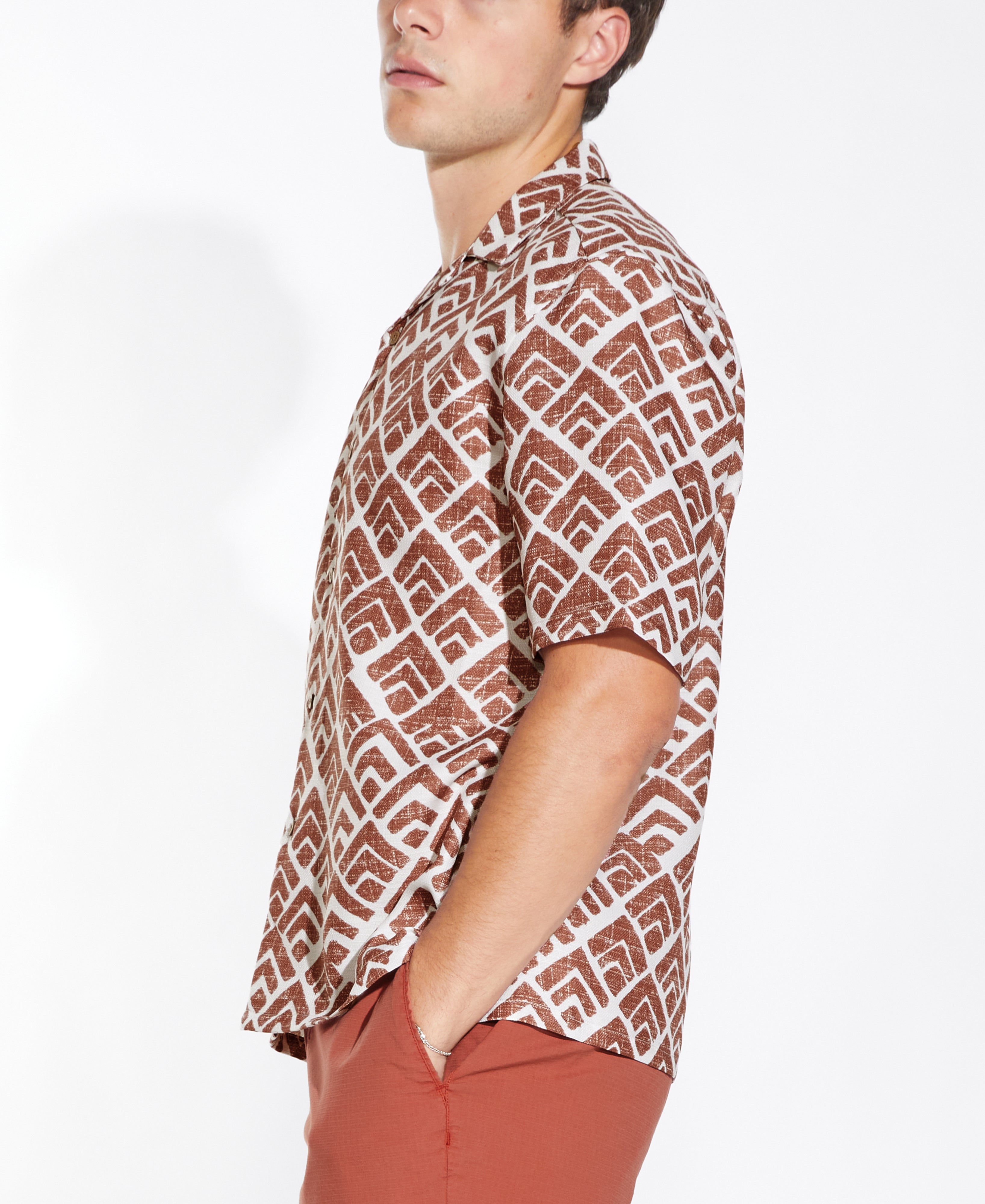 Relaxed fit short sleeve woven resort shirt in a drapey rayon slub fabric with all over geometric print