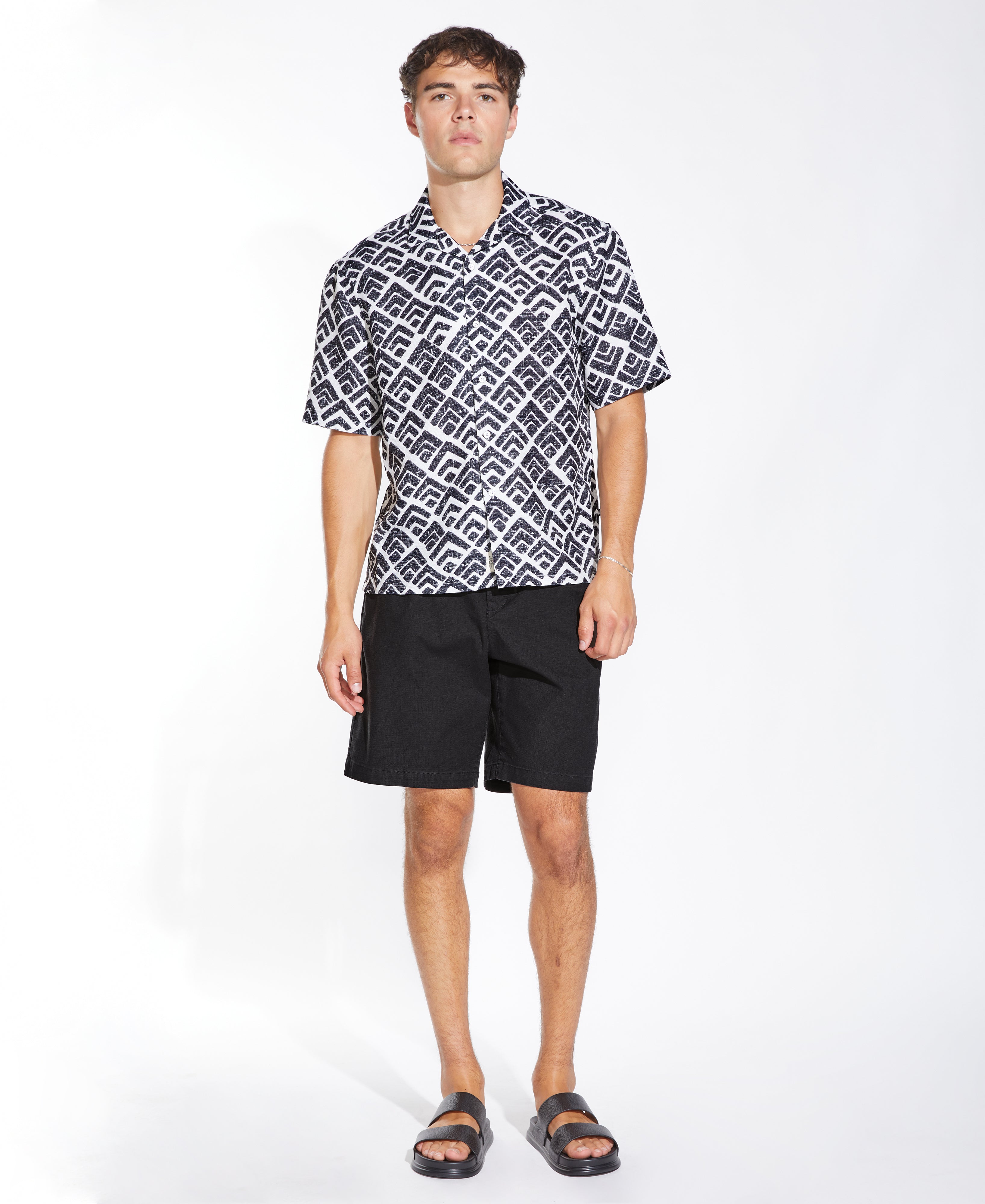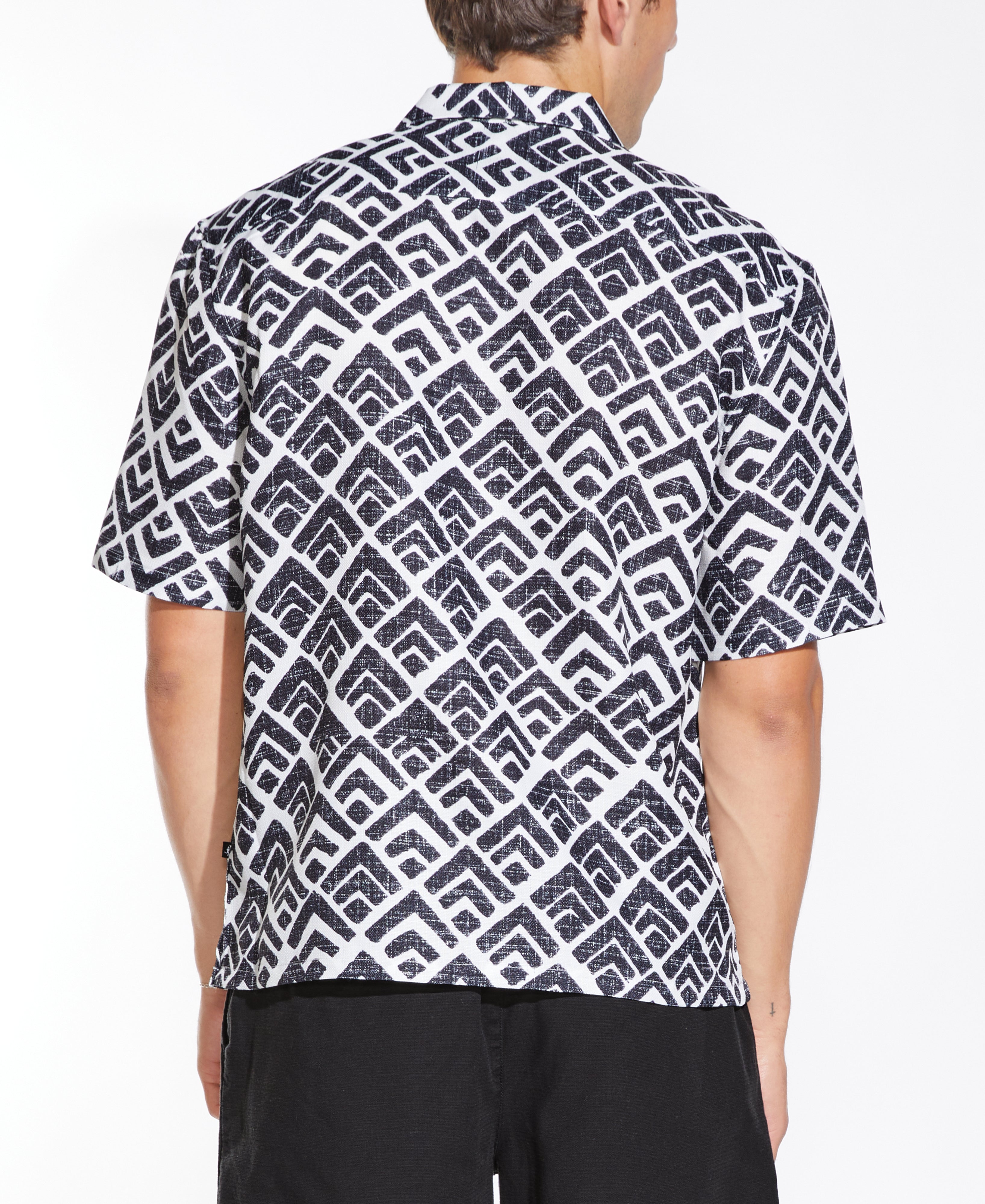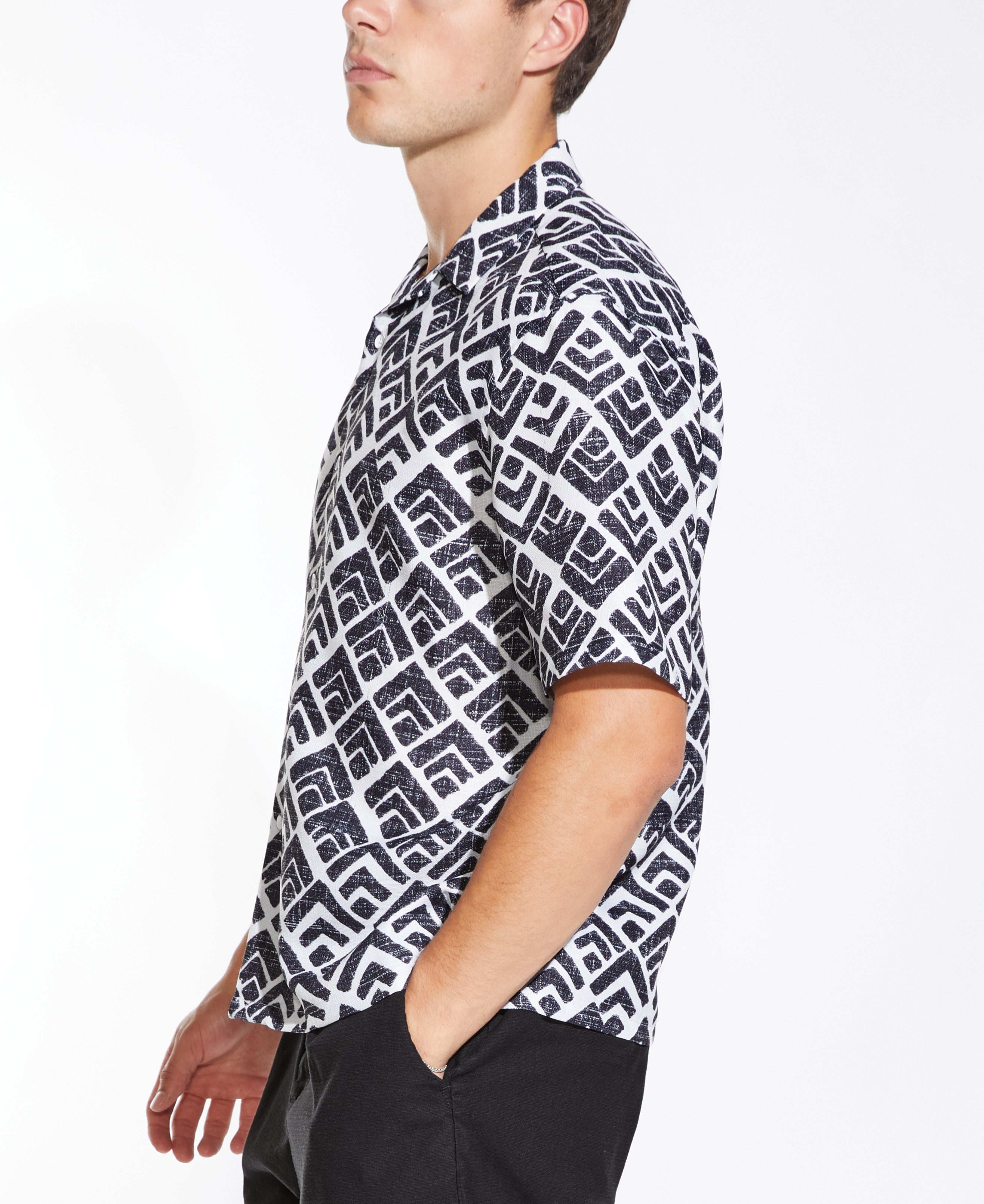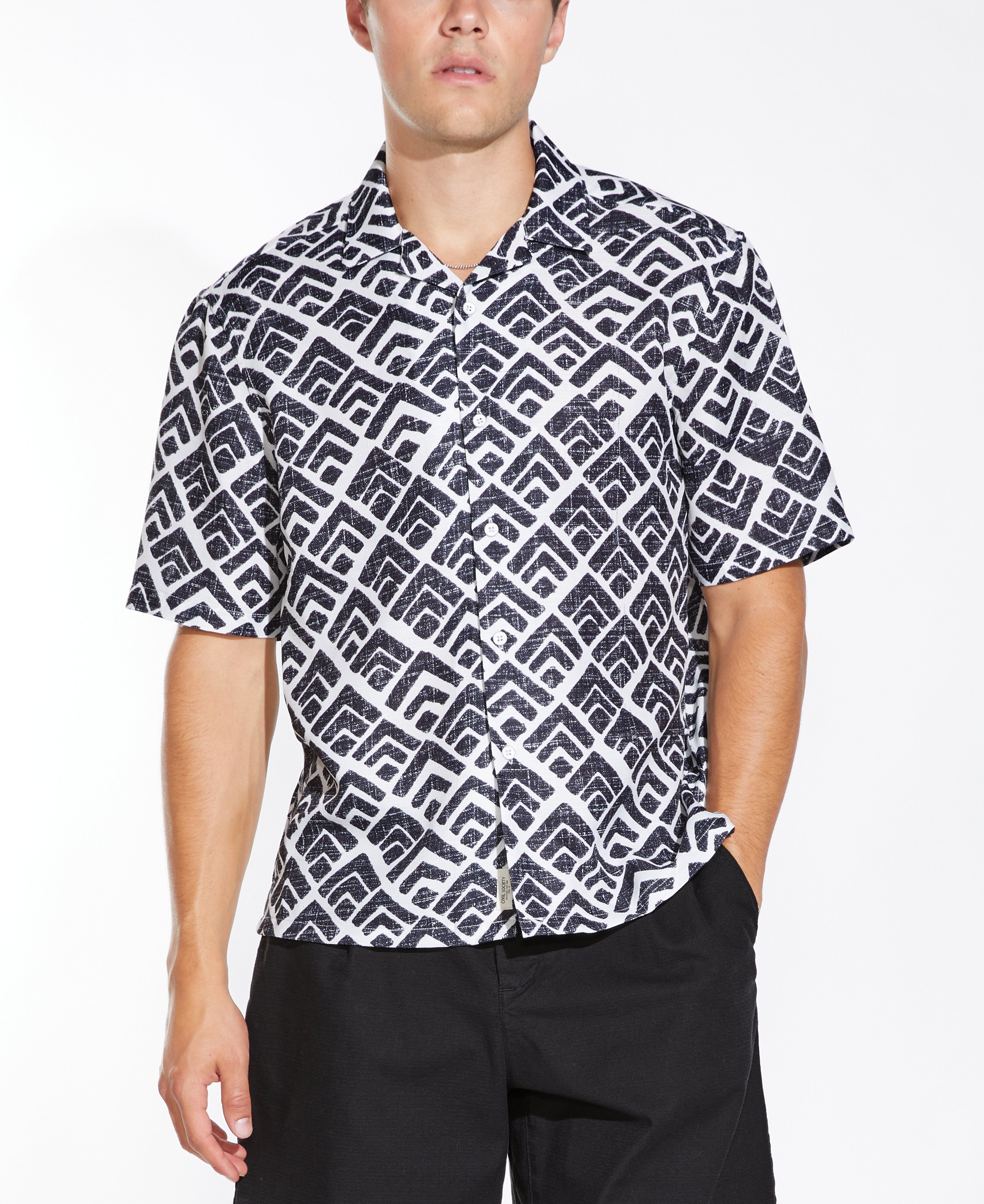 Relaxed fit short sleeve woven resort shirt in a drapey rayon slub fabric with all over geometric print