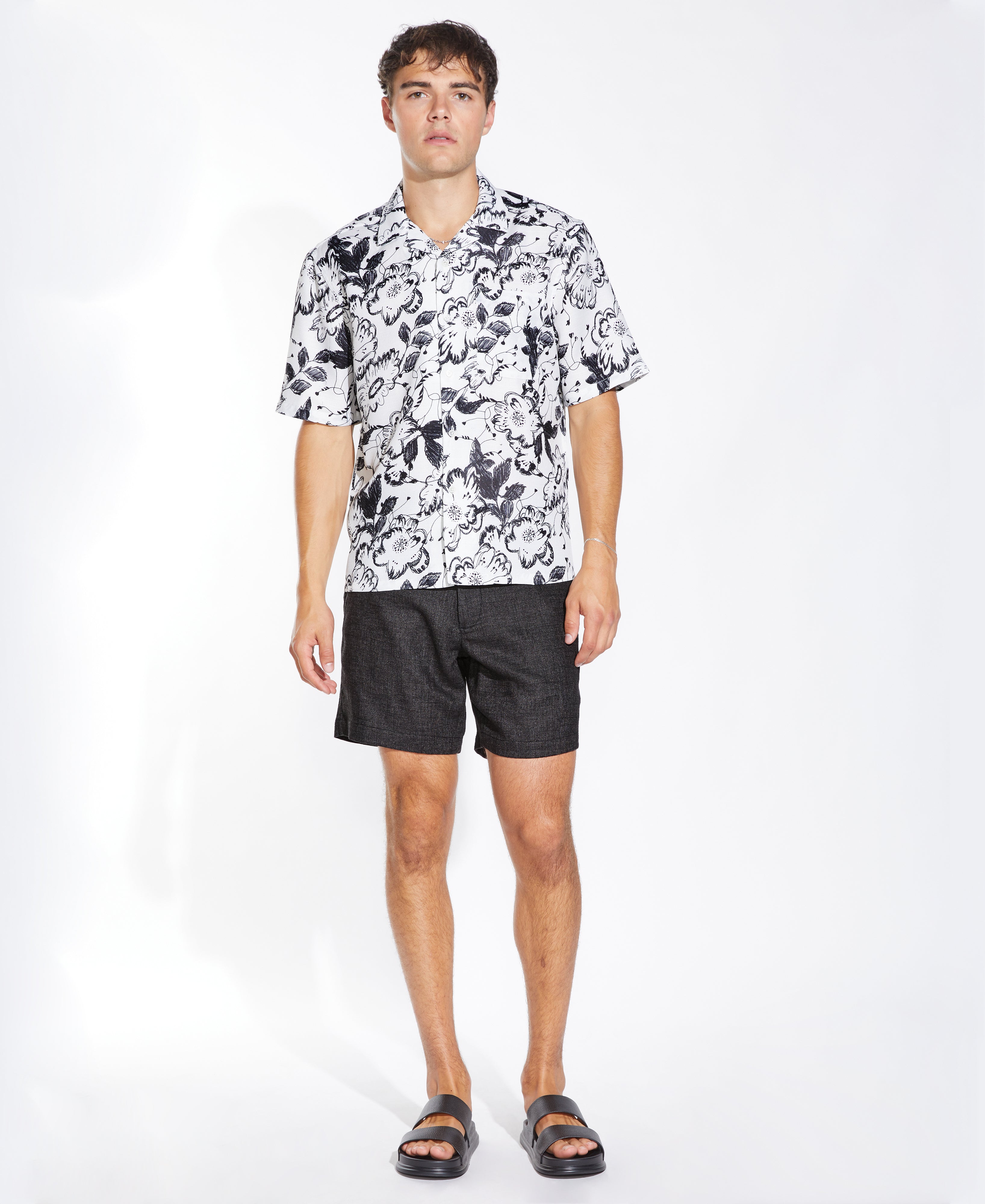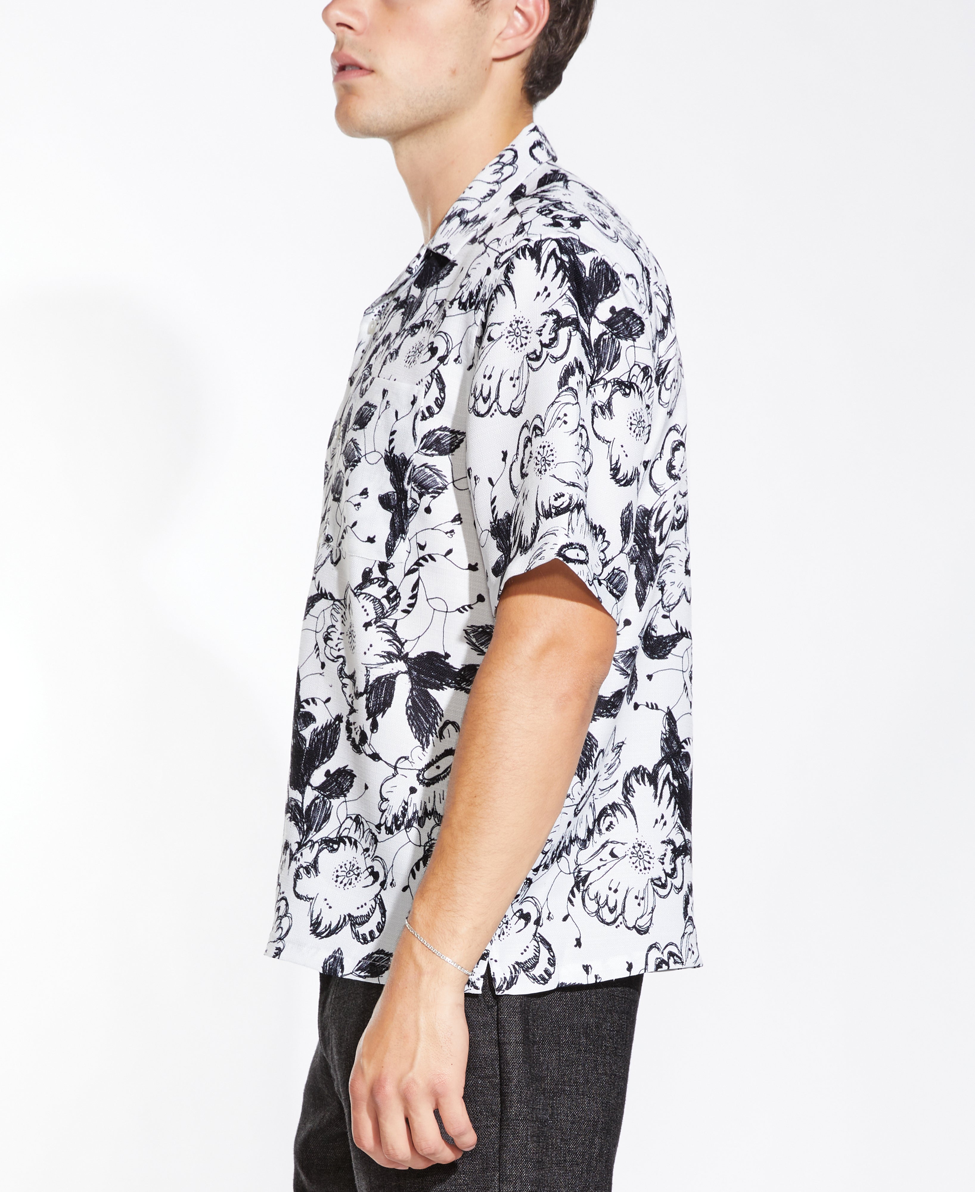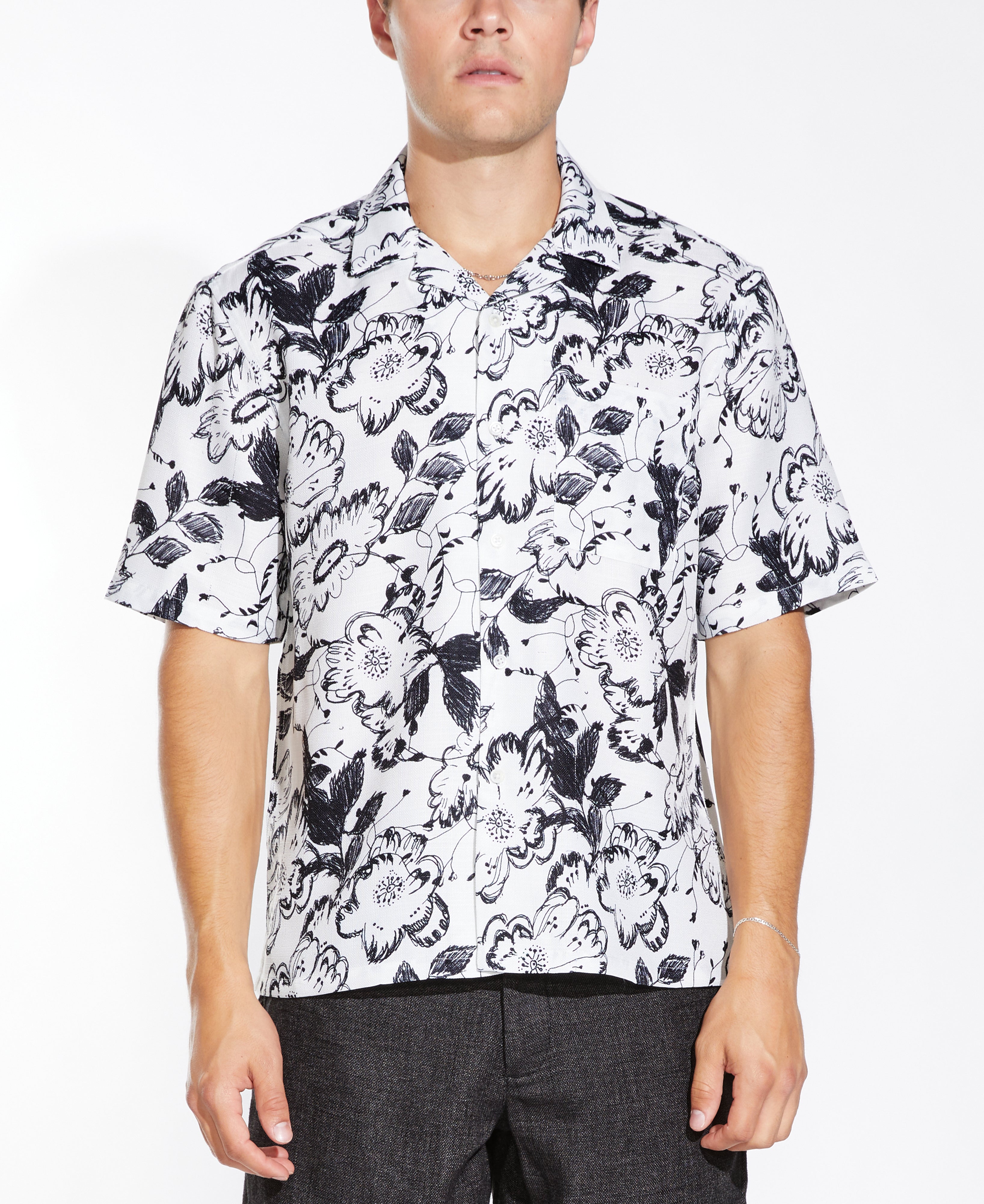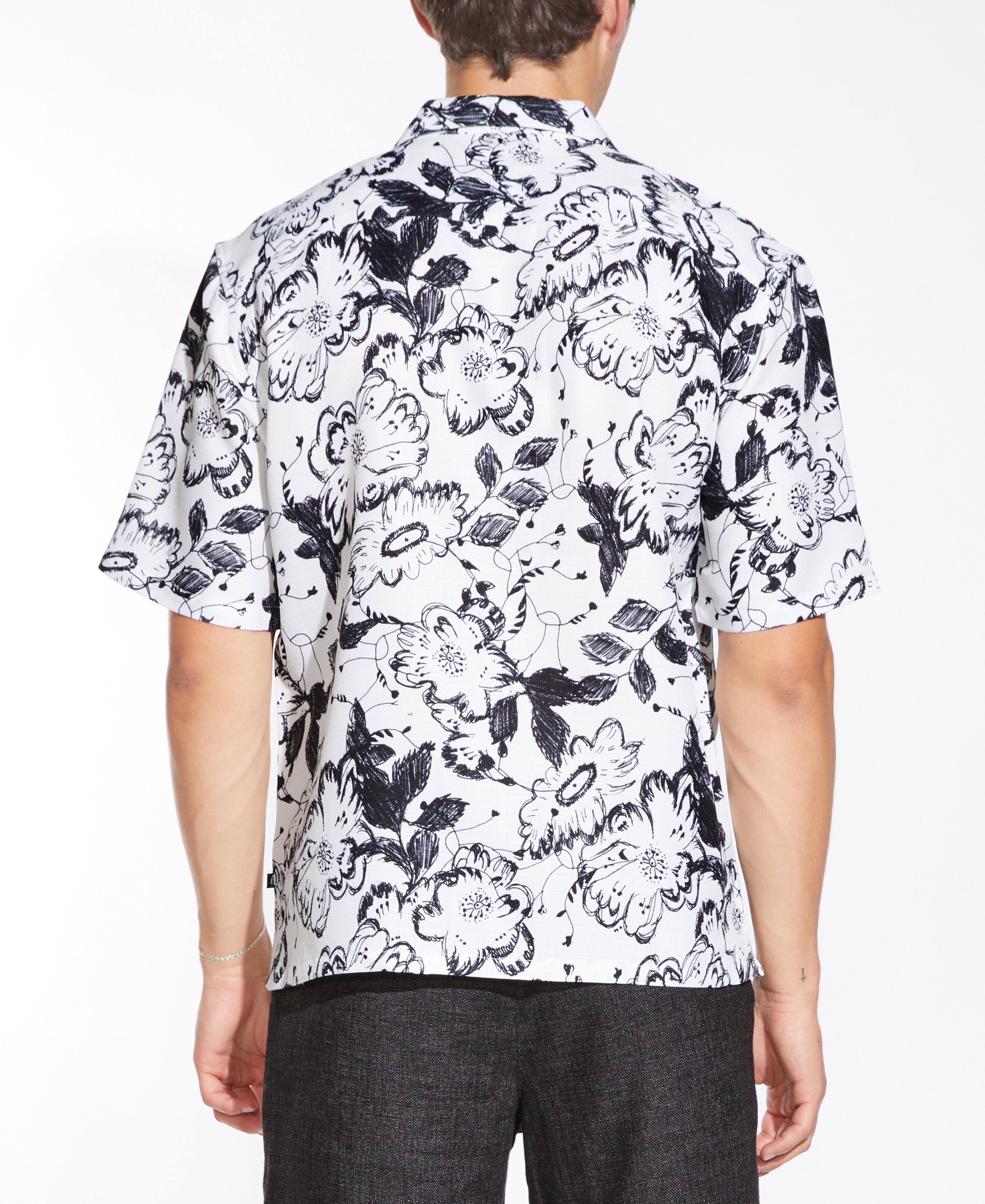 Relaxed fit short sleeve woven resort shirt in a drapey rayon slub fabric with all over floral print