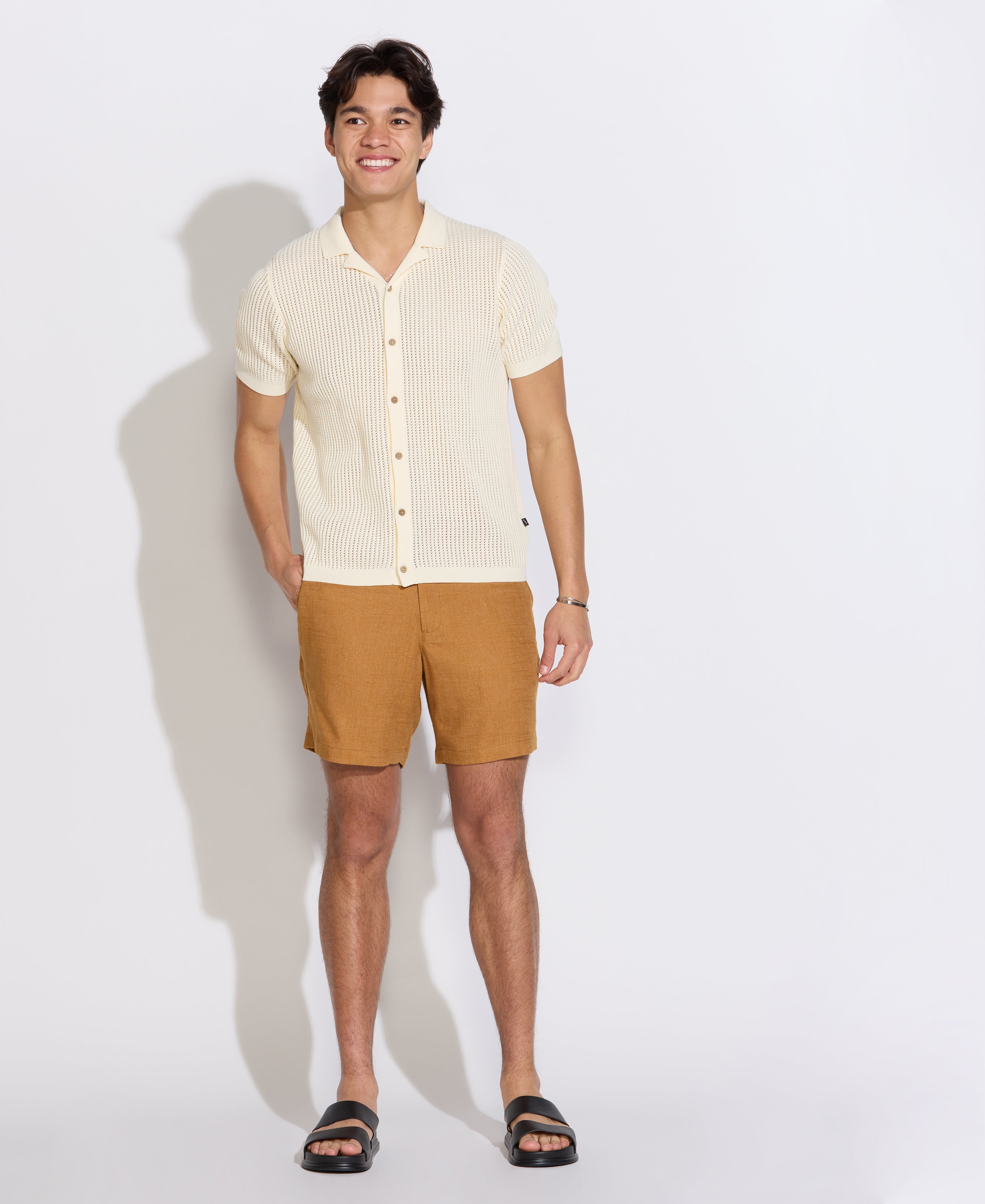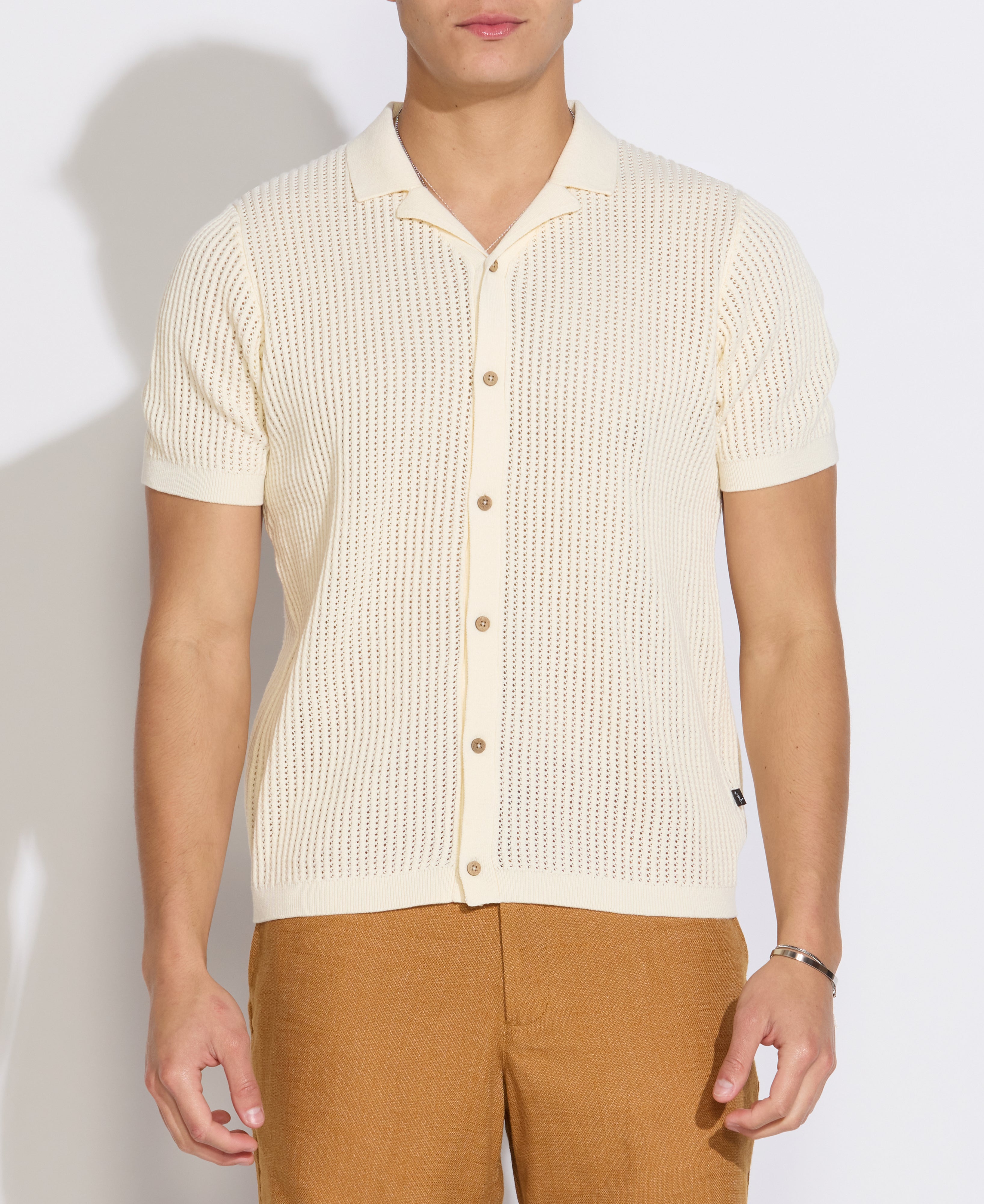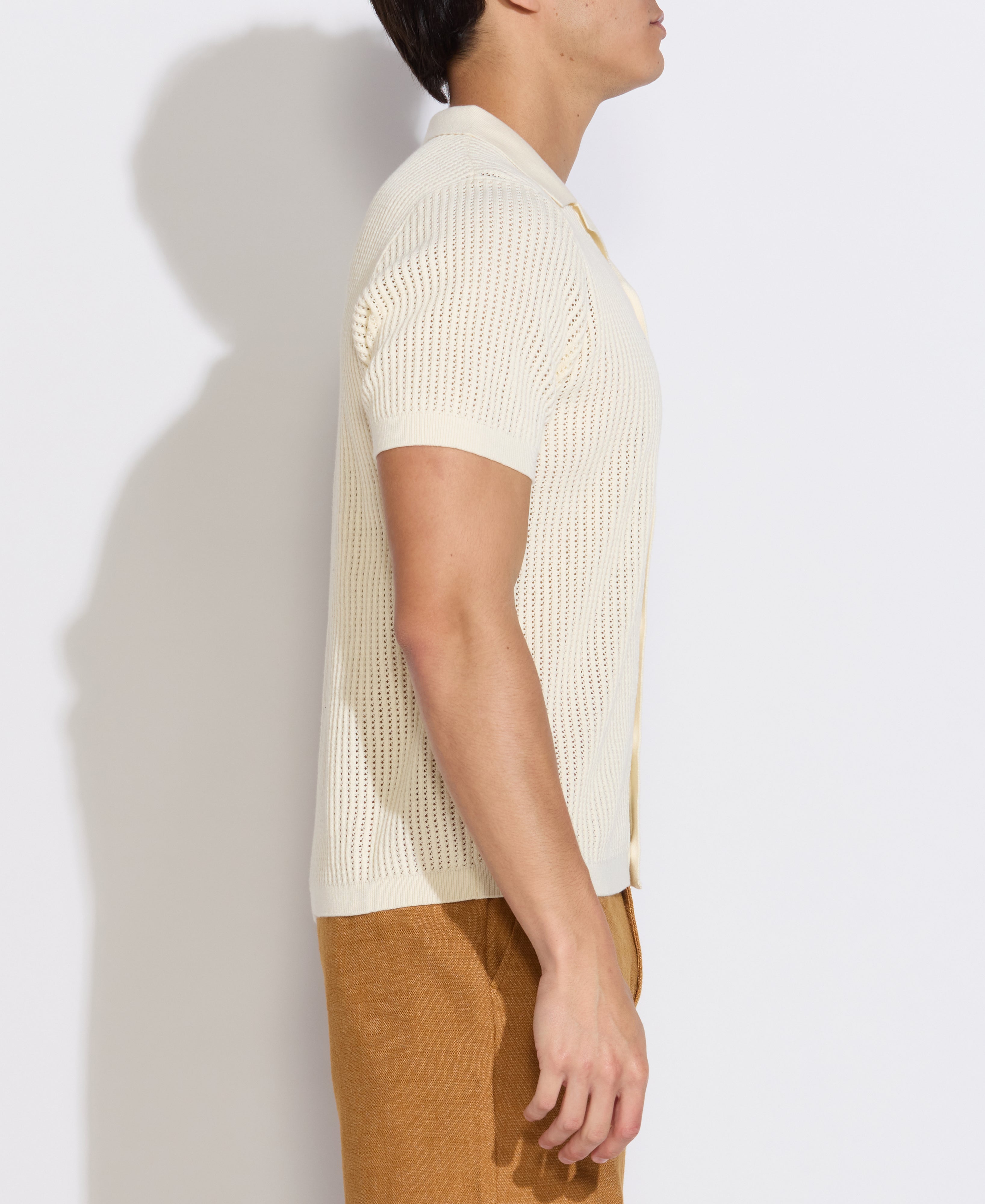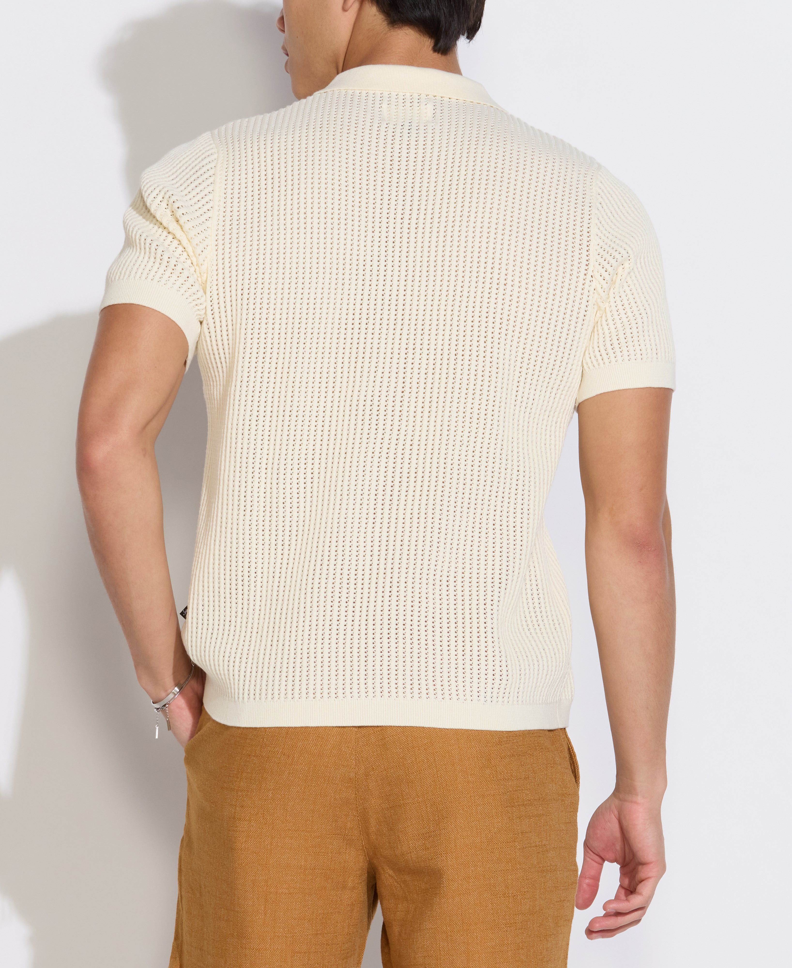 Super soft cotton full placket sweater polo featuring a casual resort collar and an open crochet-style knit. Modern, clean and classic yet very much on-trend. This sweater polo fits comfortably on the body - slightly relaxed for easy wearing but tailored enough to ensure a polished look.