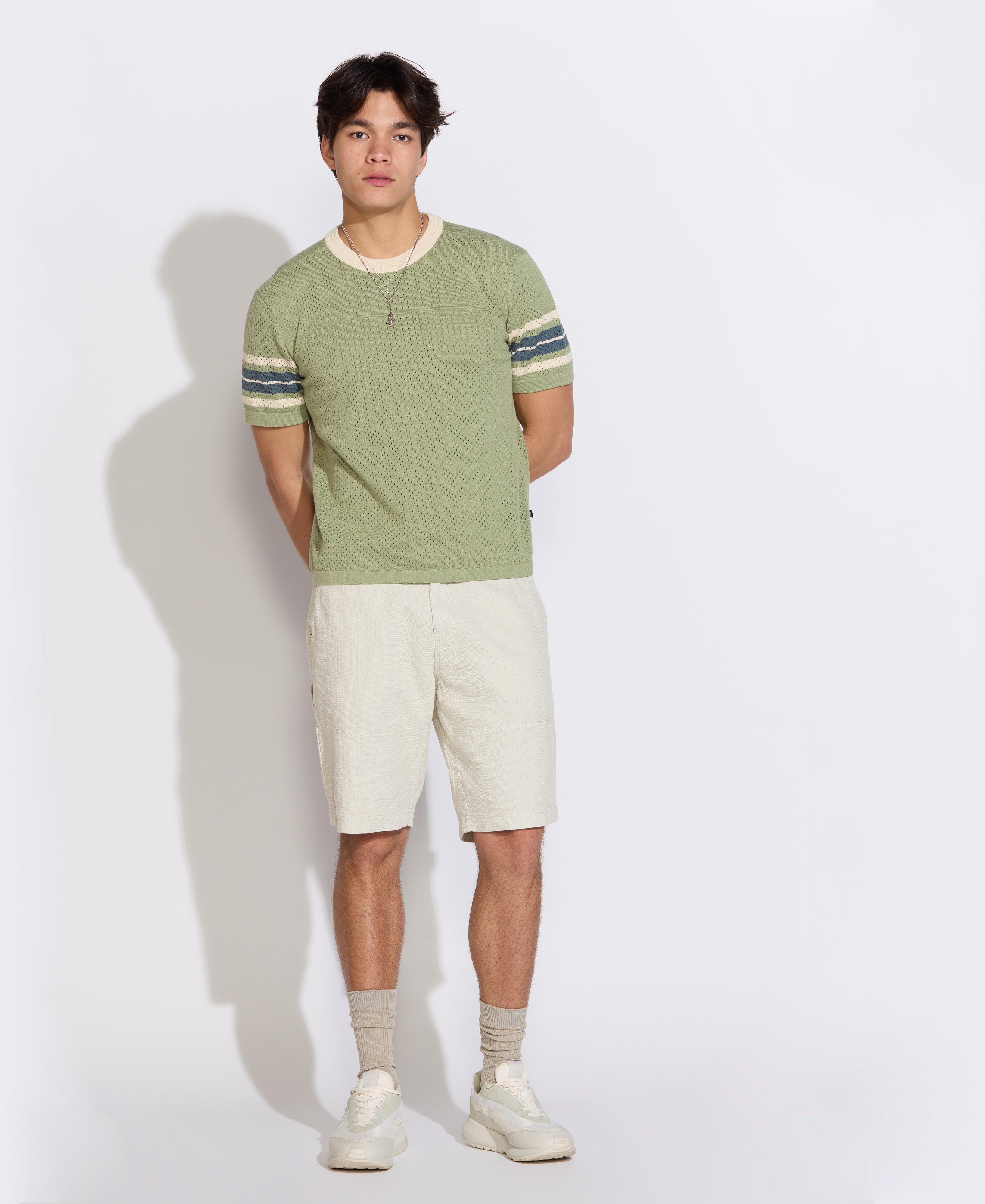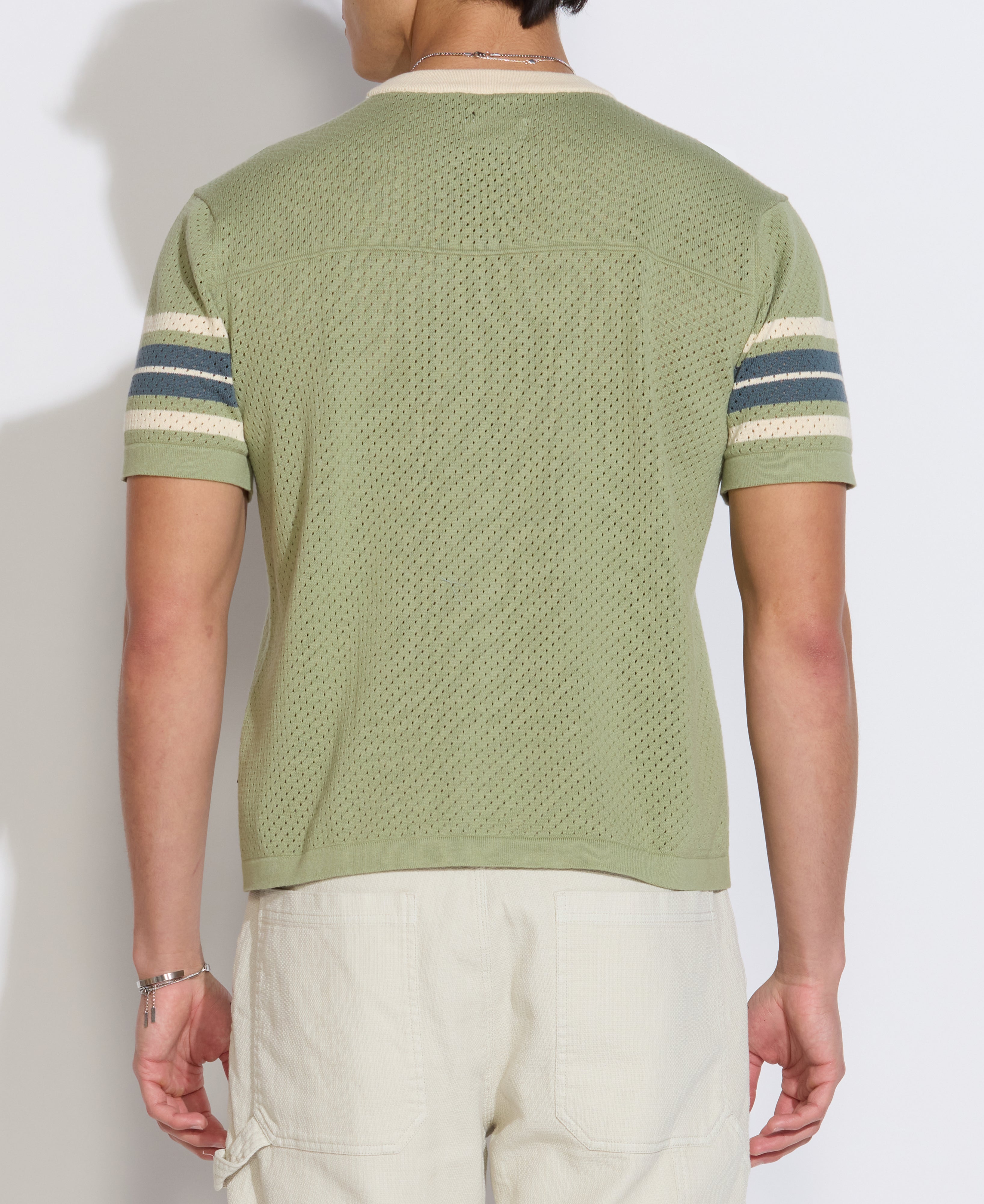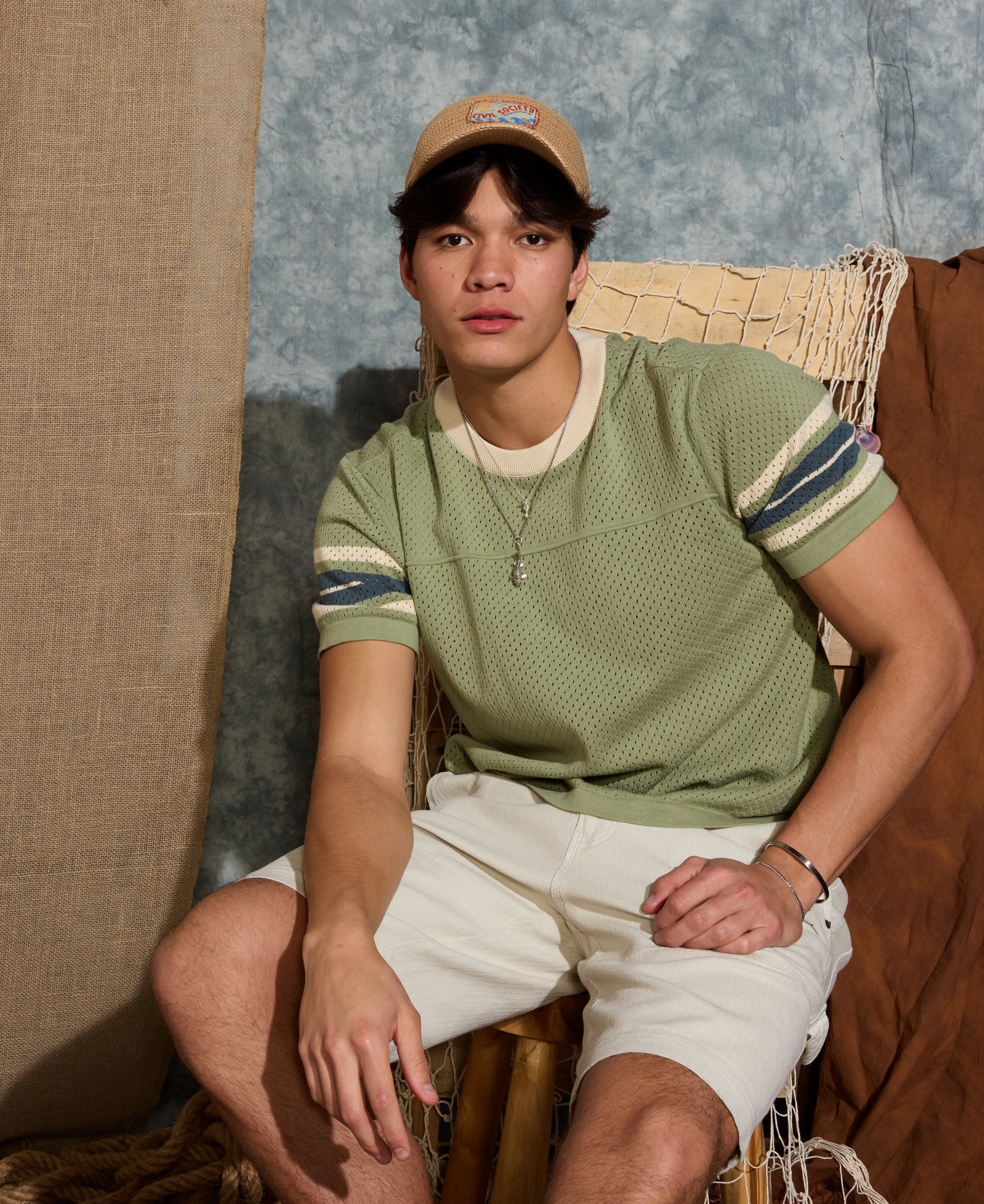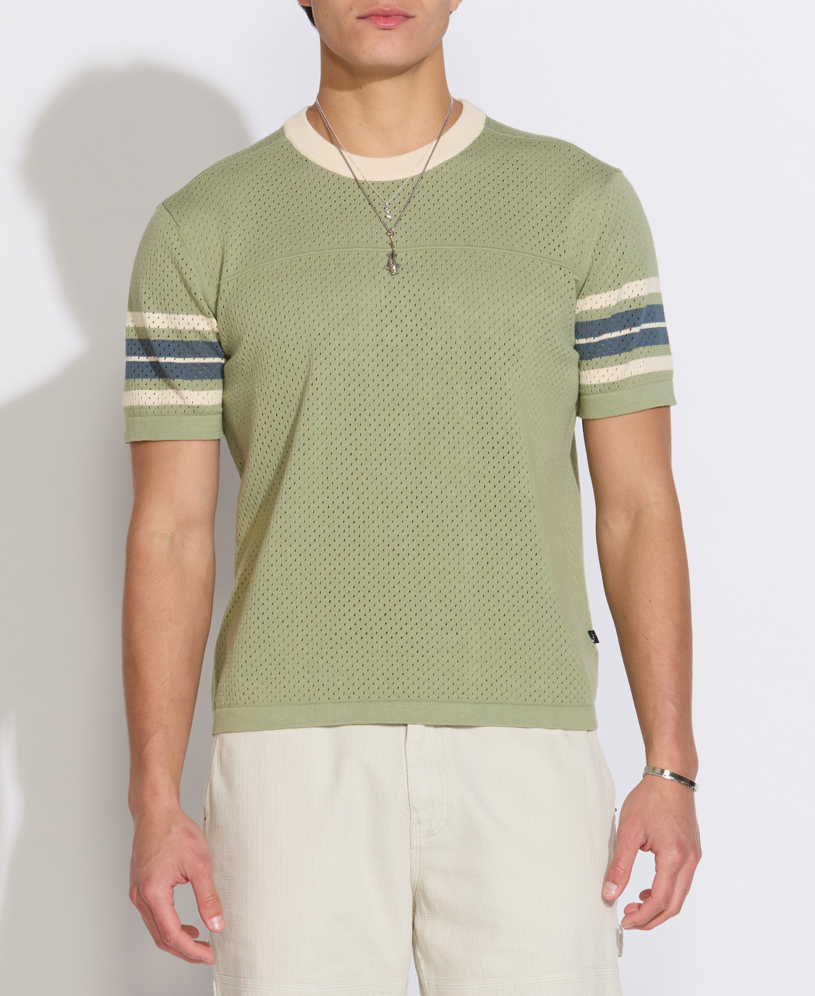 Score a fashion touchdown in this athletic-inspired sweater knit tee. Features include athletic mesh-style knitting, contrast neckband and striping at sleeves, and a relaxed silhouette with a slightly cropped length for the perfect fit.